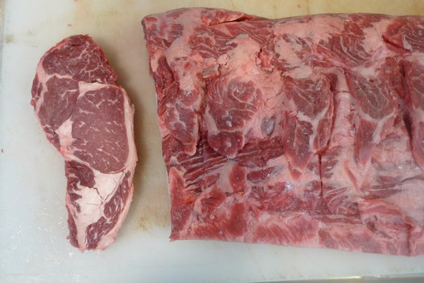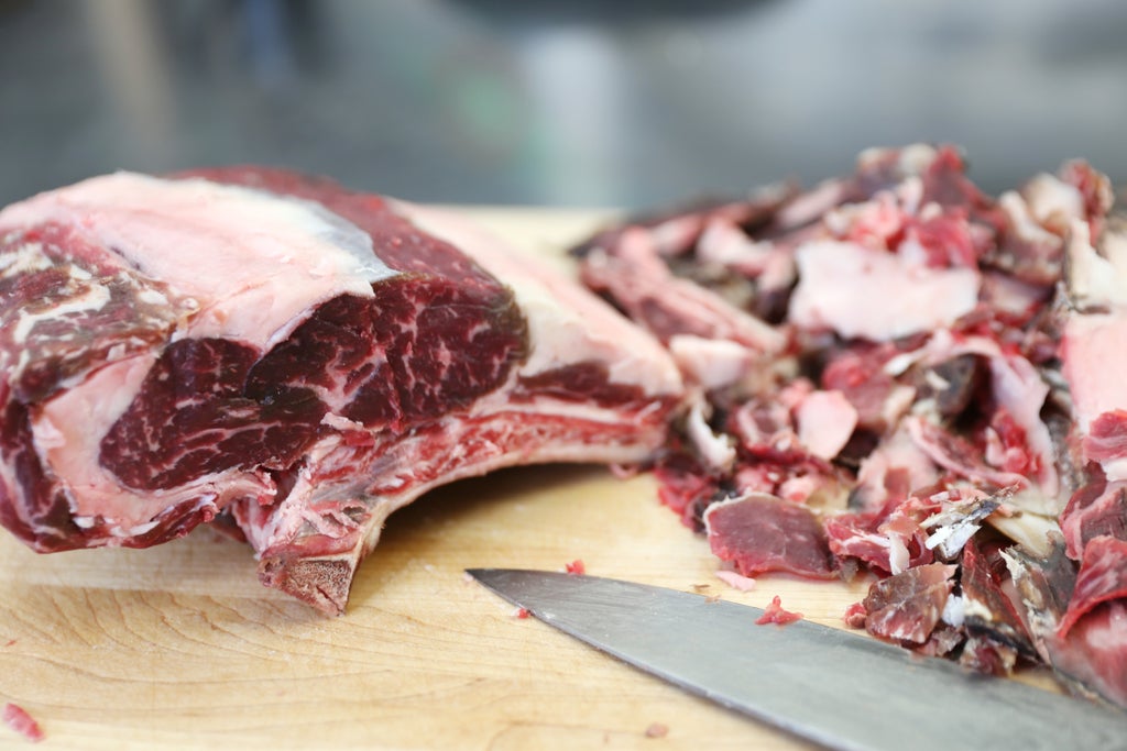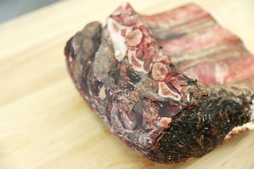 The picture above shows where the chine bone was removed. This bone can run deep inside the beef, so use a small paring knife to cut away any connective tissue then work the bone out. After, you can make cross cuts along the rib bone to make your steak cuts.
