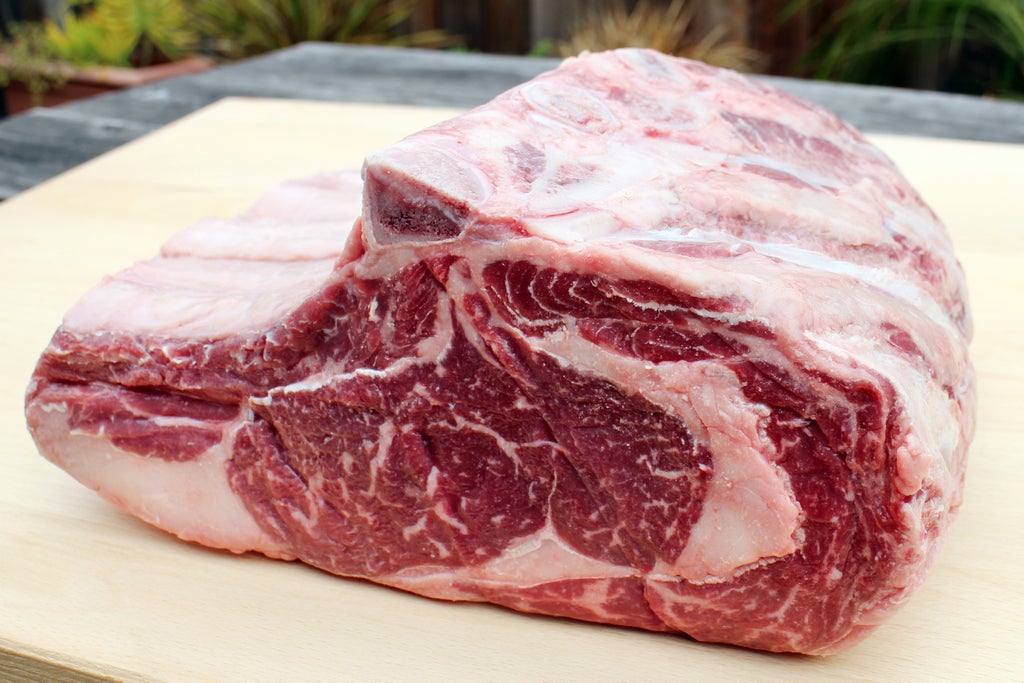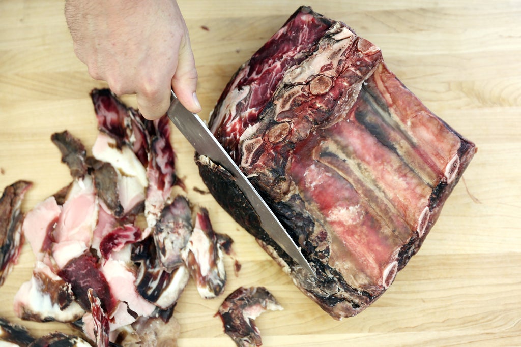 Breaking down a large section of rib like this is easy with bones in, since you just follow the length of the bone down to guide your cuts, resulting in large cuts that are best shared.