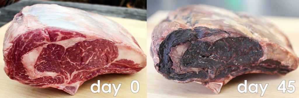 This is a carefully controlled process where the meat is left for up to five weeks in a refrigerated setting to allow natural enzymes to break down the tougher muscle fibers and connective tissues, making the meat much more tender. Enzymes are also responsible for changing the flavor of the beef to be much more complex, deepening the beefy flavor and adding in new notes not present in fresh cuts of beef.