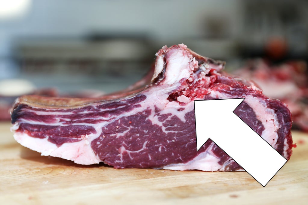 For any additional meat outside of the bones, or if you aged a cut that didn't have any ribs, make your cuts about an inch thick. Without the bone to support these cuts you can usually remove the fat tail from the steaks without missing much, but the top fat cap however should be left on for additional flavor.
