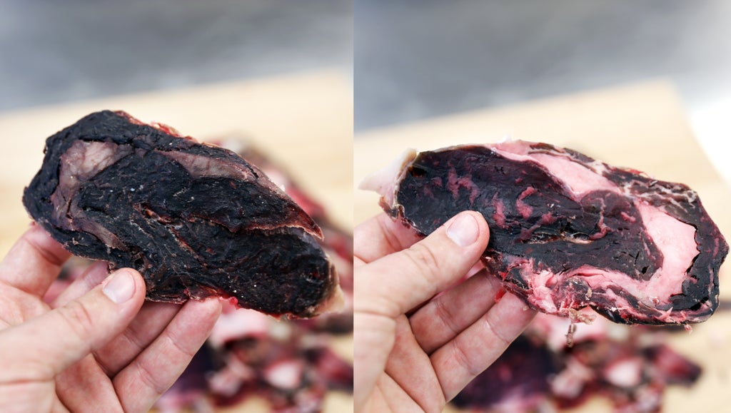 LEFT: End cap of beef showing the hard exterior. RIGHT: Reverse side of end cap showing some preservation.